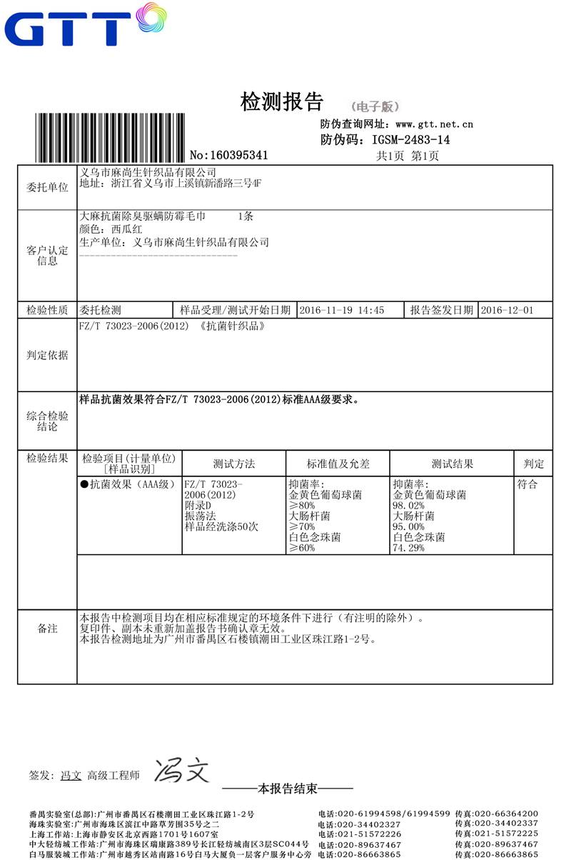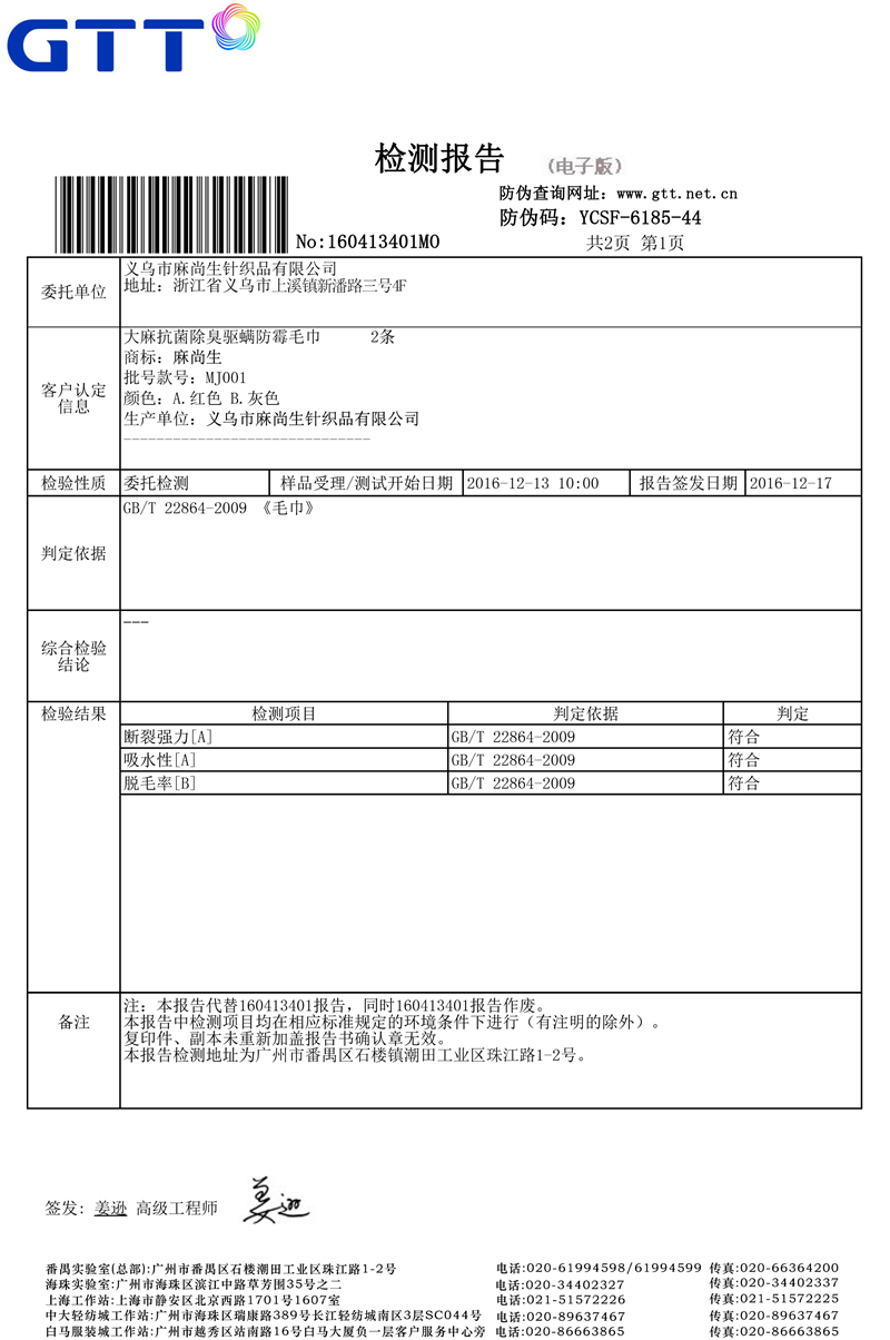 毛巾檢測報告